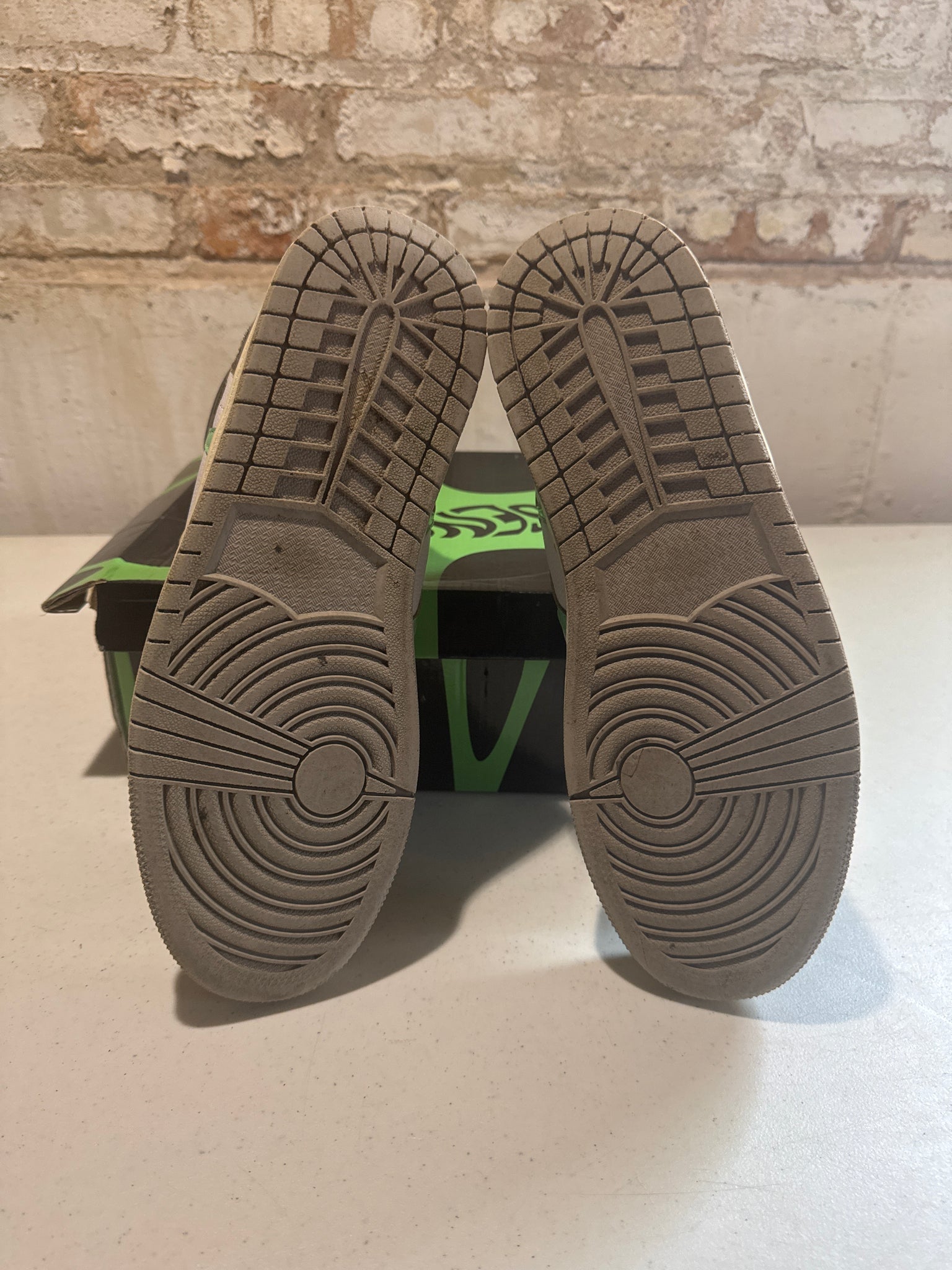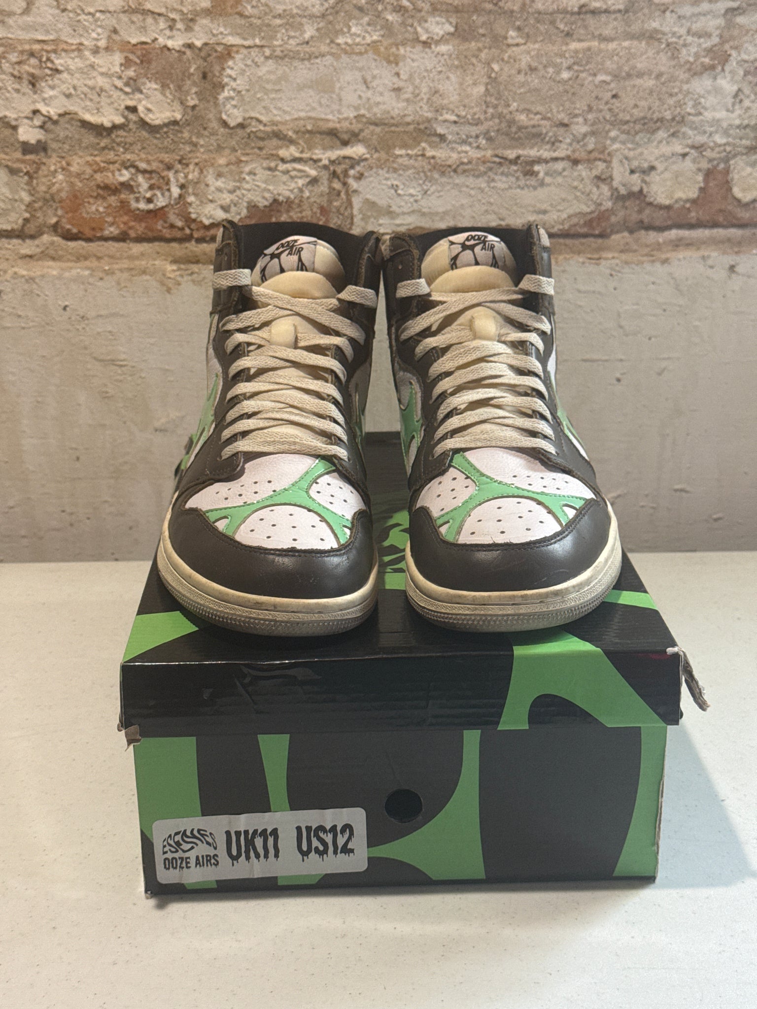 Experience a unique style with Esenses “Ooze Air” 1’s. These Jordan 1 highs feature a brown and white leather design with patent leather slime accents, bringing a touch of creativity to any outfit. In addition, the original box is included for added convenience and authenticity. Elevate your sneaker game with these one-of-a-kind shoes.